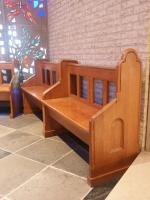Drie eikenhouten banken met een voorschot. Datering: 1950-2000. Lange bank: h. 105 cm, b. 117 cm. Korte bank: h. 105 cm, b. 94 cm.