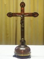 Altaarkruis van geel- en roodkoper. Datering: 1925-1950. Afmeting: h. 43 cm, b. 25 cm, diam. voet 15 cm (eventueel als set aan te vragen met altaarschel 1465-233).